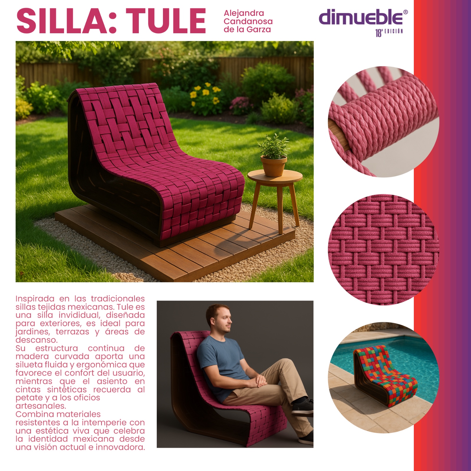 Con solo 18 años y cursando el cuarto semestre de Diseño Industrial, Alejandra Candanosa ha sorprendido con su proyecto denominado “Tule”. Se trata de una silla para exteriores diseñada para hoteles y jardines, destacando por su paleta de colores basada en el rosa mexicano y otros tonos que evocan la rica cultura del país.